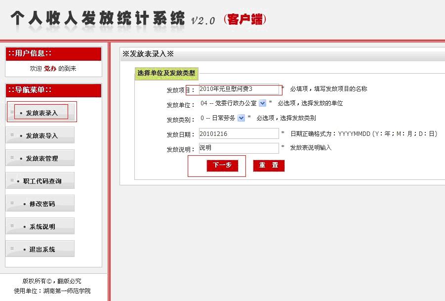 三、点击“发放表录入”,输入发放表录入下拉菜单的相关信息。(必填信息完成后点击“下一步”)