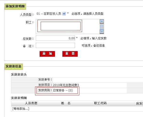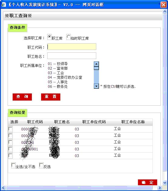 四、双击“职工”发放框,在“职工查询”框中通过“职工所属单位”找到对应的“发放人员”(可多选),逐一勾选,然后点击“确定”,录入“应发数”,点击“添加”。